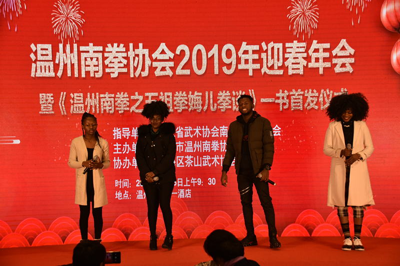 1月13日上午,温州南拳协会2019年迎春年会暨《温州南拳之五祖拳娒儿拳谈》首发仪式举行,来自尼日利亚的GADZAMA MADU ASINAMAI等国际学生为在场观众表演了非洲舞蹈及歌曲,充满活力的舞姿赢得在场观众的阵阵欢呼,歌曲《We Are The World》高低起伏,抑扬顿挫,意境丰富,引起观众的共鸣,也展现了国际学生的青春风采和多才多艺。
